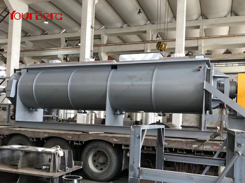 空心軸上密集排列著楔型中空漿葉,熱介質(zhì)經(jīng)空心軸流經(jīng)漿葉。單位有效容積內(nèi)傳熱面積很大,熱介質(zhì)溫度從-40℃到320℃,可以是水蒸汽,也可以是液體型:如熱水、導(dǎo)熱油等。間接傳導(dǎo)加熱,沒有攜帶空氣帶走熱量,熱量均用來加熱物料。熱量損失僅為通過器體保溫層向環(huán)境的散熱。楔型漿葉傳熱面具有自清潔功能。物料顆粒與楔型面的相對運動產(chǎn)生洗刷作用,能夠洗刷掉楔型面上附著物料,使運轉(zhuǎn)中一直保持著清潔的傳熱面。漿葉干燥機的殼體為Ω型,殼體內(nèi)一般安排二到四根空心攪拌軸。殼體有密封端蓋與上蓋,防止物料粉塵外泄而充分發(fā)揮作用。