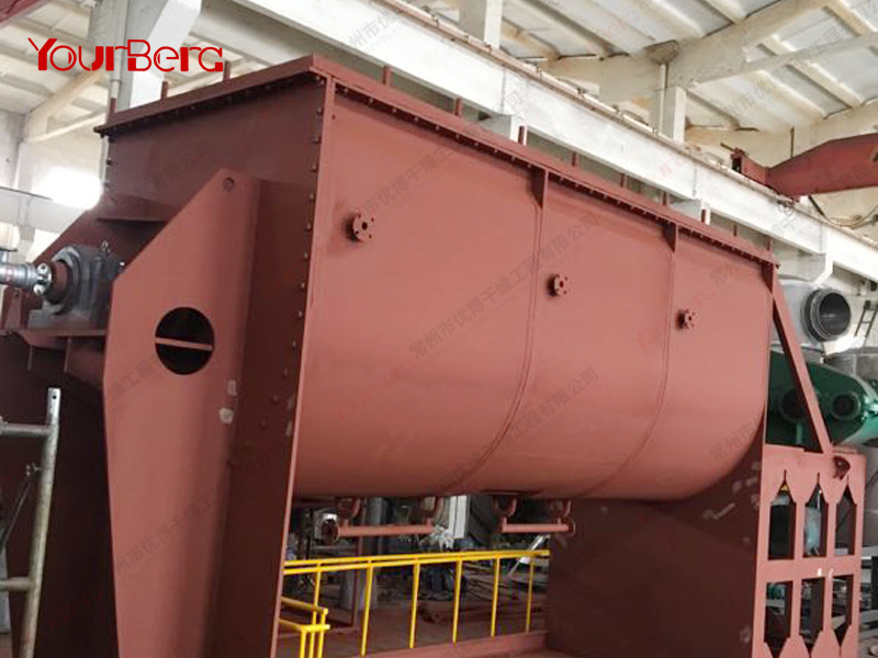 空心軸上密集排列著楔型中空漿葉,熱介質(zhì)經(jīng)空心軸流經(jīng)漿葉。單位有效容積內(nèi)傳熱面積很大,熱介質(zhì)溫度從-40℃到320℃,可以是水蒸汽,也可以是液體型:如熱水、導(dǎo)熱油等。間接傳導(dǎo)加熱,沒(méi)有攜帶空氣帶走熱量,熱量均用來(lái)加熱物料。熱量損失僅為通過(guò)器體保溫層向環(huán)境的散熱。楔型漿葉傳熱面具有自清潔功能。物料顆粒與楔型面的相對(duì)運(yùn)動(dòng)產(chǎn)生洗刷作用,能夠洗刷掉楔型面上附著物料,使運(yùn)轉(zhuǎn)中一直保持著清潔的傳熱面。漿葉干燥機(jī)的殼體為Ω型,殼體內(nèi)一般安排二到四根空心攪拌軸。殼體有密封端蓋與上蓋,防止物料粉塵外泄而充分發(fā)揮作用。
