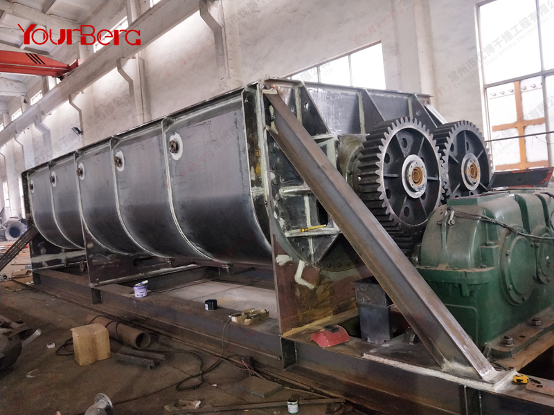 空心軸上密集排列著楔型中空漿葉,熱介質(zhì)經(jīng)空心軸流經(jīng)漿葉。單位有效容積內(nèi)傳熱面積很大,熱介質(zhì)溫度從-40℃到320℃,可以是水蒸汽,也可以是液體型:如熱水、導(dǎo)熱油等。間接傳導(dǎo)加熱,沒有攜帶空氣帶走熱量,熱量均用來加熱物料。熱量損失僅為通過器體保溫層向環(huán)境的散熱。楔型漿葉傳熱面具有自清潔功能。物料顆粒與楔型面的相對運(yùn)動(dòng)產(chǎn)生洗刷作用,能夠洗刷掉楔型面上附著物料,使運(yùn)轉(zhuǎn)中一直保持著清潔的傳熱面。漿葉干燥機(jī)的殼體為Ω型,殼體內(nèi)一般安排二到四根空心攪拌軸。殼體有密封端蓋與上蓋,防止物料粉塵外泄而充分發(fā)揮作用。