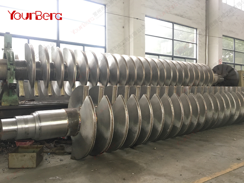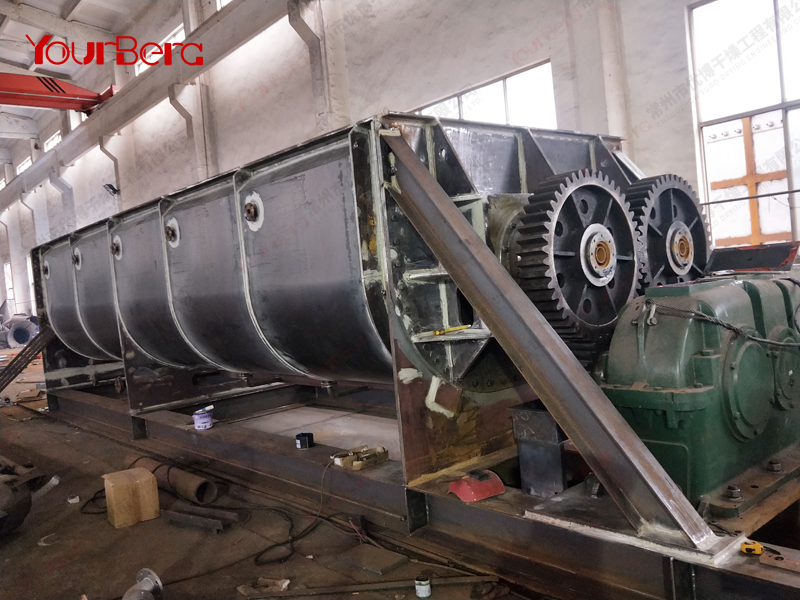 空心軸上密集排列著楔型中空漿葉,熱介質經空心軸流經漿葉。單位有效容積內傳熱面積很大,熱介質溫度從-40℃到320℃,可以是水蒸汽,也可以是液體型:如熱水、導熱油等。間接傳導加熱,沒有攜帶空氣帶走熱量,熱量均用來加熱物料。熱量損失僅為通過器體保溫層向環(huán)境的散熱。楔型漿葉傳熱面具有自清潔功能。物料顆粒與楔型面的相對運動產生洗刷作用,能夠洗刷掉楔型面上附著物料,使運轉中一直保持著清潔的傳熱面。漿葉干燥機的殼體為Ω型,殼體內一般安排二到四根空心攪拌軸。殼體有密封端蓋與上蓋,防止物料粉塵外泄而充分發(fā)揮作用。