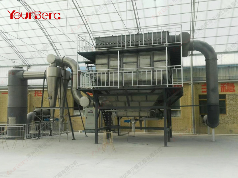 散粒狀固體物料由加料器加入流化床干燥器中,過(guò)濾后的潔凈空氣加熱后由鼓風(fēng)機(jī)送入流化床底部經(jīng)分布板與固體物料接觸,形成流態(tài)化達(dá)到氣固的熱質(zhì)交換。物料干燥后由排料口排出,廢氣由沸騰床頂部排出經(jīng)旋風(fēng)除塵器組和布袋除塵器回收固體粉料后排空。蒸汽、電、熱風(fēng)爐均可配用(按用戶(hù)要求配套)。