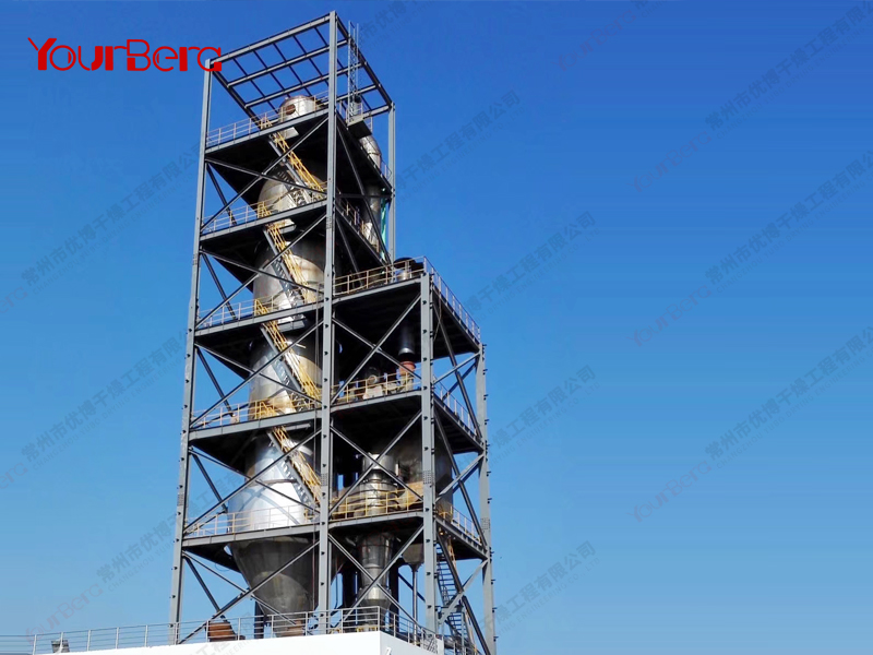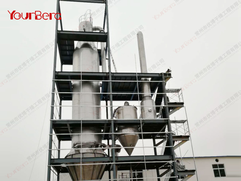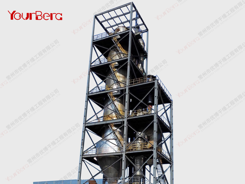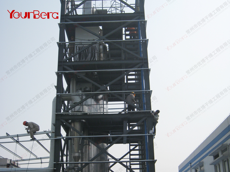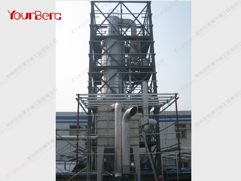 料液通過(guò)隔膜泵高壓輸入,噴出霧狀液滴,然后同熱空氣并流下降,大部分粉粒由塔底排料口收集,廢氣及其微小粉末經(jīng)旋風(fēng)分離器分離,廢氣由抽風(fēng)機(jī)排出,粉末由設(shè)在旋風(fēng)分離器下端的授粉筒收集,風(fēng)機(jī)出口還可裝備二級(jí)除塵裝置,回收率在96-98%以上。