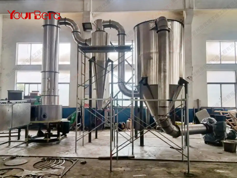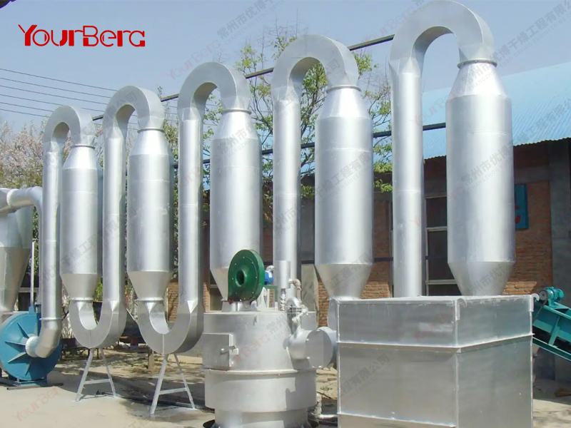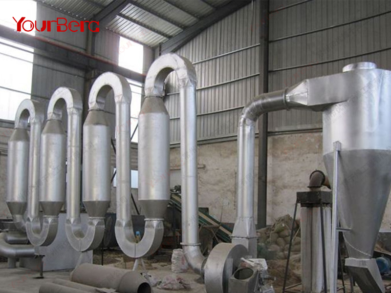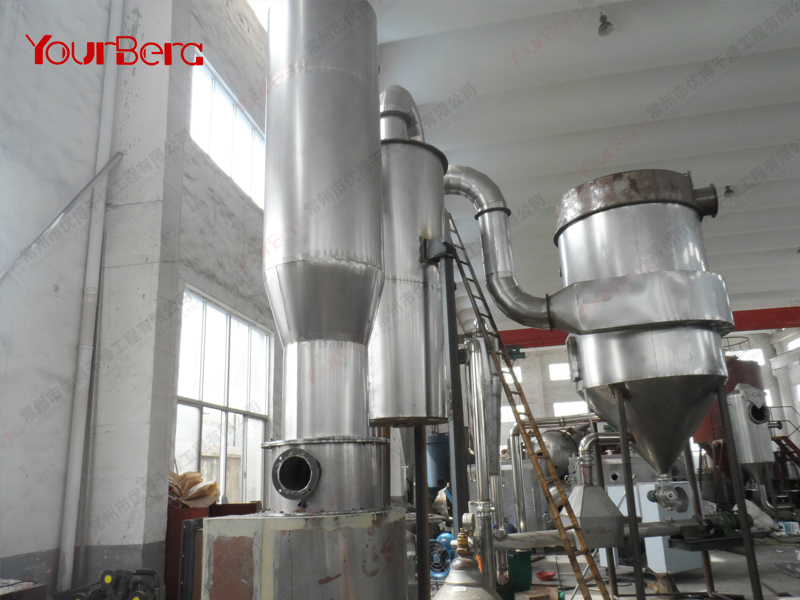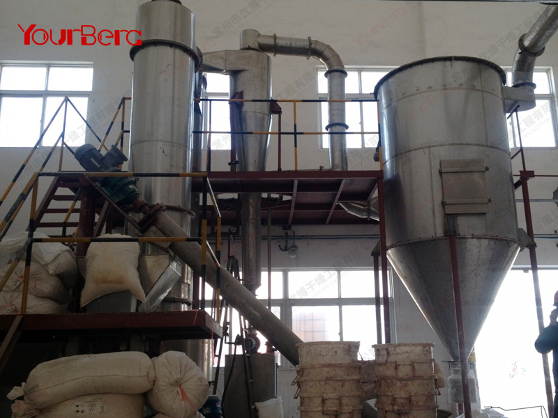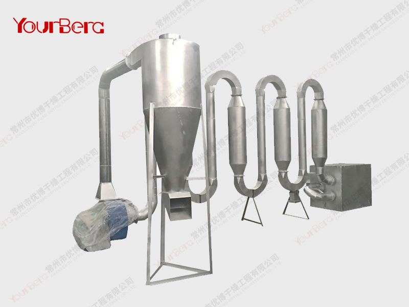 上述這類物料具有特殊性:比重輕,加料難,易燃,易爆。針對此情況,我公司技術(shù)部門開發(fā)研制的新型氣流干燥機(jī),在原氣流干燥機(jī)的基礎(chǔ)上改進(jìn)了加料形式,解決了“架橋”現(xiàn)象。創(chuàng)新改進(jìn)了旋風(fēng)分離器,解決了物料翻滾不出料的現(xiàn)象。系統(tǒng)集成,控制先進(jìn),超溫報(bào)警連鎖關(guān)閉熱源,有效解決了溫度過高引起的燃燒爆炸問題。